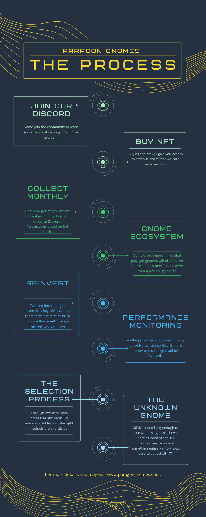 Alienwolf Studios will also receive a percentage of the profits that are generated by the trading bot. The percentage of the profits that are allocated to Alienwolf Studios will provide the revenue to grow and divided accordingly among holders of the protocol. As the funds in the trading account continue to grow, the more self-sustaining Paragon Gnomes will become. Through these strategic partnerships, Alienwolf Studios eliminates the need for a constant stream of new investors in order to be able to reward their holders. Our Investing as a Service (IaaS) protocol serves as a “trading bot service” that currently offers investors a monthly rev share of the trading bot's profits limited by the amount of NFTs held. The funds received from the profit shares are divided into Marketing, reinvestment into the Paragon Gnomes, and to our Holders. By doing so, we will have an extra stream of revenue coming into the project other than the percentage from the transaction taxes. This additional funding is what enables us to build a sustainable passive income opportunity for cryptocurrency investors. Unlike other cryptocurrencies that offer residual income, Alienwolf Studios does not require a minimum amount in order to earn a percentage of your investment daily. The ultimate aim is to provide investors with the opportunity to earn up to 30% APR a month regardless of the amount they choose to invest via nftsLong-term goals